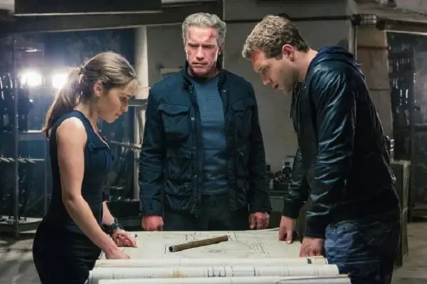 Sarah (Emilia Clarke) e Pops sabem que outro terminador será publicado em 1984. Kyle Reese (Jai Courtney) chegará, bem como um T-1000 e o casal interceptivo e também o salvou. Eles matam o T-800 original e o usam para completar uma máquina do tempo que construíram. Espera -se que salte diretamente em 1997 para destruir Skynet, mas Reese conta a eles sobre uma visão que ele teve quando viajou ao longo do tempo, ele o faz acreditar que eles deveriam viajar depois de 2017 para parar o Skynet lá.