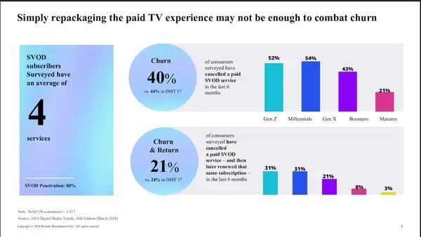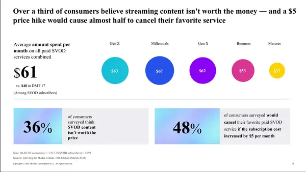 Cerca de 36% dos questionados disseram que o conteúdo da SVOD não valia o preço e que 48% indicam que interromperiam sua assinatura favorita se seus custos aumentassem 5 USD por mês. Os entrevistados da Geração Y e da Geração Y pagam uma média de US $ 63 ou 67 por mês, enquanto o gene X e o Boomer pagam US $ 62 e US $ 53 por mês.