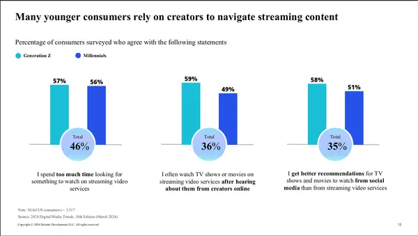 Quase 50% disseram que gastaram muito tempo procurando conteúdo de transmissão para vê -los. Mais da metade (54%) da geração Millennial e Z acha que recebe melhores recomendações para programas de televisão e filmes para redes sociais em comparação com os serviços de transmissão e cerca de um terço dos consumidores e 59% da geração Z, os entrevistados, geralmente vêem programas de televisão ou serviços de SVOD depois de ouvi -los online.