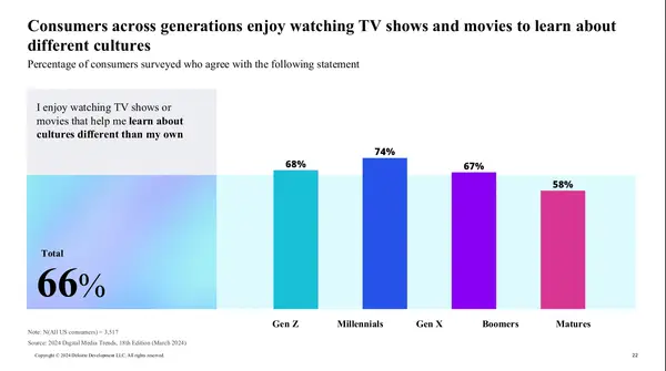 Além disso, os streamers devem usar conteúdo mais diferente. Cerca de 66% dos consumidores entrevistados disseram ter visto programas de televisão e filmes que os ajudam a aprender algo sobre suas diferentes culturas. Esse número representou 74% dos entrevistados em mil anos, 68% da geração de vigilância de geração Z e 67% dos entrevistados da geração X e do boom. Mehr als 40% der befragten verbraucher stellten fest, dass Das Das SoAle Video Velfältiger War Als Fernsehrramm und Film. Esse número para a geração Z e mais de 50% atingiram 60% e para consumidores pretos, multi-RAC, hispânicos e latinx e LGBTQIA.