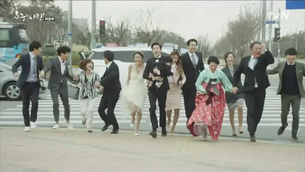 Ho-gu: E daí? Estaremos cruzando juntos. A festa de casamento faz exatamente isso - atravessar a rua contra um sinal vermelho, cheio de sorrisos e excitação.