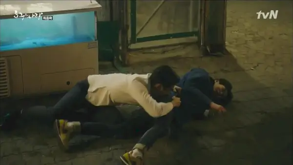 Ho-gu se inclina sobre a mesa para dar um soco no rosto de Kang-chul, e eles lutam lá fora. Hahaha! É a luta mais hilária de todas, já que ambos passam mais tempo se debatendo e rastejando pelo chão. Meu Deus, Kang-chul – você acabou de morder a bunda de Ho-gu?