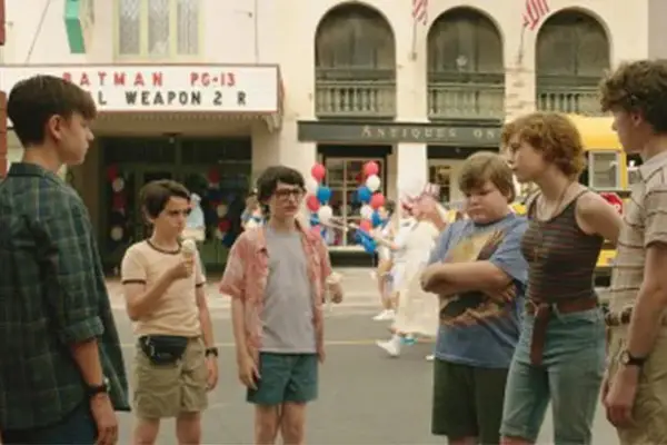 O grupo de perdedores em frente ao cinema no centro de Derry.